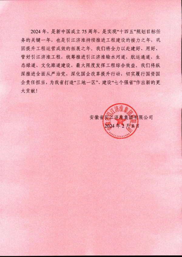 2024年,市引江公司繼續(xù)深入貫徹落實黨的二十大精神,不斷鞏固拓展主題教育學習成果,不折不扣落實省委省政府、市委市政府、市國資委重大決策部署,以時時放心不下的責任感、積極擔當作為的精氣神履好職、盡好責,在全力做好引江濟淮二期征遷建設(shè)的同時,以昂揚的姿態(tài)全面建設(shè)百里畫廊規(guī)劃建設(shè)、港口碼頭及航道建設(shè)、臨時用地復(fù)墾等工作的順利進行,為促進江淮運河沿線區(qū)域高質(zhì)量發(fā)展貢獻更多力量。